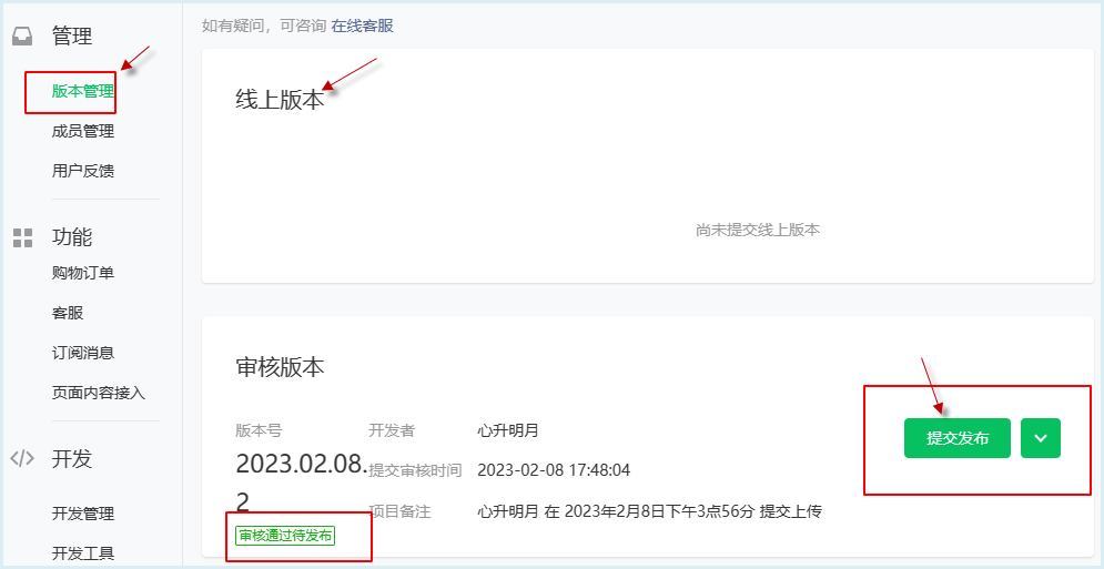 4)等待微信的測試審核,通過后,小程序才能發布